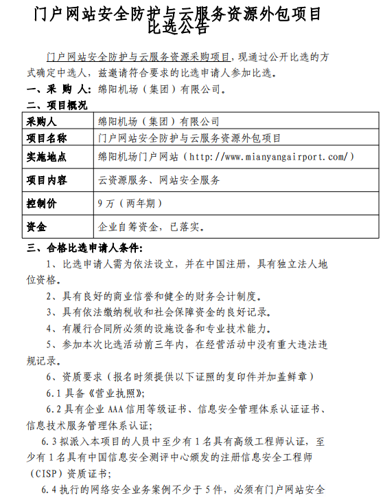 門戶網(wǎng)站安全防護(hù)與云服務(wù)資源外包項目比選公告