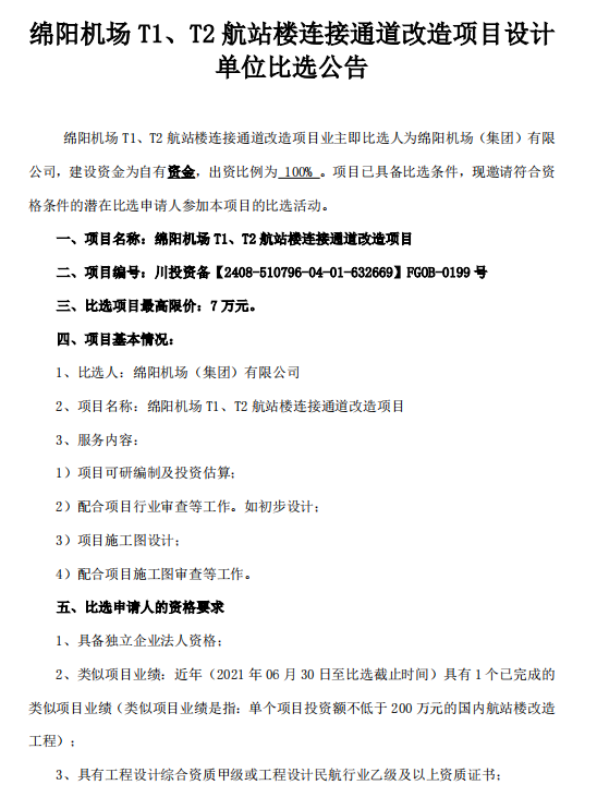 綿陽機(jī)場 T1、T2 航站樓連接通道改造項(xiàng)目設(shè)計(jì)單位比選公告