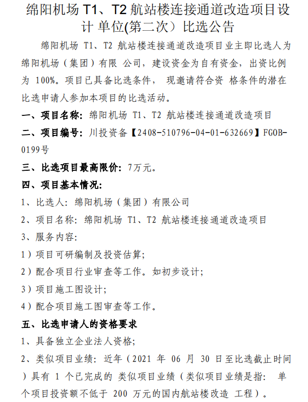 綿陽機場 T1、T2 航站樓連接通道改造項目設計單位(第二次)比選公告